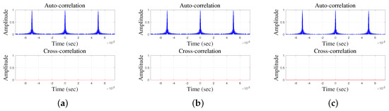 As, according to Figure 3, the cross-correlations between transmitted signals (the second term in Equation (5)) are fully suppressed (i.e., zero), the MAI (second term in Equation (5)) will have no effect. Therefore, one could accurately calculate the TOF even though multiple transmitters transmit signals simultaneously.