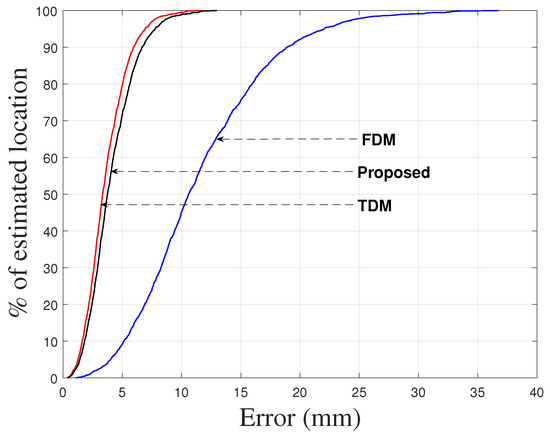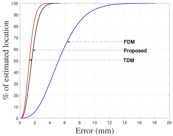 Cumulative absolute location errors (from simulations) of target (receiver) obtained for the proposed, TDM and FDM techniques.
