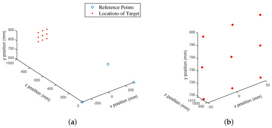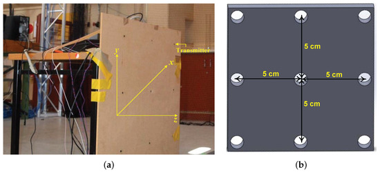 The configurations of the reference points and targets are shown in Figure 5a,b respectively. In Figure 5a although 9 transmitters (reference points) are visible, only the side ones in the middle row and central one in the top row were used. Piezotite MA40S4S and MA40S4R US devices, which centre frequency is around at 40 kHz, were used as transmitters and receivers respectively. According to the procedure described in Section 4, three orthogonal chirp waveforms were generated. As for the simulation, all the waveforms were generated from a 35–45 kHz/5 ms chirp signal.