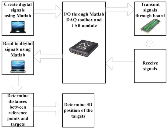 The three waveforms were distributed to the reference points and transmitted simultaneously with the aim of localizing the receivers. The experimental process is shown in Figure 6. The input signals into the transmitters were from a screw pin board [22] which was connected to a Measurement Computing USB-1604 data acquisition (DAQ) module (the sampling rate of which was 1 Msample/s) [22]. The DAQ was also connected to a laptop and hence Matlab, in order to be able to send the transmission signals. This configuration also allowed for the capture of the received signal using the DAQ and the DAQ tool boxes in Matlab. The setup was the same for every set of orthogonal chirp waveforms and each location measurement was repeated 100 times. Please note that for a positioning system which requires a very high degree of accuracy (millimeter), the selection of its data acquisition (DAQ) module was an important issue. In order to determine an appropriate interface for the positioning system, potential detection errors were studied under a specific scenario which involves investigating how many errors will be introduced if the time detection is delayed by one sample which helps to ascertain the sampling rate to be used to maintain millimeter accuracy. Using the common audio interface, the sampling rate of which is 100 kHz, i.e., a sampling time of , if the detection is out by one sample period, when the speed of sound is , the prospective error in the predicted distance () will be: