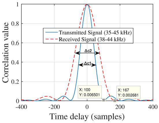Auto-correlation width of the transmitted and received signal where the correlation width () 100 and () 167 refers 10 kHz and 6 kHz respectively according to the formula [15].