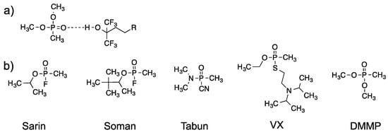 (a) Hydrogen bonding interaction between HFIP and DMMP; (b) Structures of CWAs and a CWA simulant, DMMP.