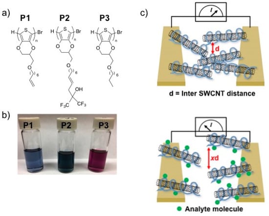 Building upon our experience, we report here a sequel to our previous method by using a derivatized poly(3,4-ethylenedioxythiophene) (PEDOT) polymer to produce a more robust CWA sensor. Though the fabricated PT/SWCNT devices proved to be selective and sensitive (sub ppm detection limit), they experienced significant performance degradation within days of fabrication, likely due to SWCNT aggregation. PEDOT, in comparison to PT, is much more polarizable and an electron-rich material, which generates stronger interactions to form a polymer-SWCNT composite with improved stability [27,28]. HFIP groups are introduced to impart selectivity for binding of DMMP and are introduced through the functionalization of terminal alkene-containing sidechain attached to the PEDOT backbone. Alkene cross metathesis reactions [29] facilitate the attachment of molecular recognition elements to the side chains to create derivatized PEDOT polymers with desired selectivity. In this report, we detail three PEDOT analogs, P1, P2 and P3, to wrap SWCNTs to create CWA sensitive chemiresistive sensors (Figure 2a). The designed PEDOT derivatives also impart the necessary solubility to effectively de-bundle and disperse SWCNTs as shown in Figure 2b. In contrast to our previous work, where thin films were spin-casted upon a glass substrate, these chemiresistor devices are fabricated by drop casting of a polymer/SWCNT dispersion between two metal electrodes on a glass substrate to form random networks of polymer-wrapped SWCNTs (Figure 2c, top). Using this drop-casting methodology, a very small amount of polymer/SWCNT is used to make a large number of devices.