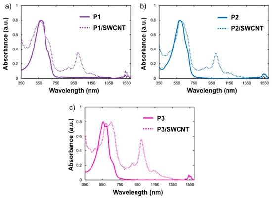 UV–vis/NIR spectra of polymer/SWCNT dispersions. (a) P1/SWCNT; (b) P2/SWCNT; (c) P3/SWCNT.