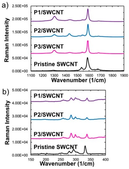 Resonance Raman spectroscopy is a useful tool in confirming the presence of SWCNTs in polymer dispersions. The full resonance Raman spectra of the composites and pure polymer are given in Figures S17 and S18. Thin film samples were prepared for analysis by drop casting dispersions from THF (P1 and P3) or DMF (P2) onto a silicon wafer. A pristine SWCNT thin film was prepared by drop casting (6,5) enriched SWCNTs from a fresh dispersion in ortho-dichlorbenzene on to a silicon wafer. The spectra were taken using a 633 nm excitation wavelength and are normalized to the intensity of the G-band, at 1590 cm−1 and offset for clarity. In Figure 4a, Raman spectrum for the D-G band region is displayed. The D-band, located at 1290 cm−1, is indicative of the disruption of the sp2 network in conjugated nanocarbon systems [50]. The ratio of intensities of the D band (1290 cm−1), to the G band (ID/IG) can give relative measure of disruption of the graphene π-system. After dispersion, there is a large increase in ID/IG from the pristine SWCNTs to the polymer-dispersed SWCNTs. Specifically, the ID/IG is 0.06 in pristine SWCNTs and 0.9, 0.8, and 0.7 for the P1/SWCNT, P2/SWCNT and P3/SWCNT composites, respectively. This indicates an increase in the number of defects in the SWCNT sidewalls within the dispersion [50]. The source of the disruption in this case is hypothesized to be breaking of the conjugation of the SWCNT sp2 network during the sonication step in the dispersion preparation or the result of strong associations between the graphene walls and the dispersing polymers or other molecules/molecular fragments [51,52]. The broad Raman peak located at 1422 cm−1 in the polymer dispersions is attributed entirely to the polymer and can be seen distinctly in Figure S18. The radial breathing modes (RBM), shown in Figure 4b, are the signature for the presence of carbon nanotubes and are located between 100–300 cm−1. The peak frequencies are inversely proportional to tube diameter. The as received pristine SWCNTs gave a peak at 252 cm−1 and overlapping peaks at 277 cm−1 and 290 cm−1, whereas the polymer/SWCNT dispersions are slightly narrowed maxima and positioned at 283 cm−1 and 297 cm−1. A full Raman spectrum is shown in Figure S17.