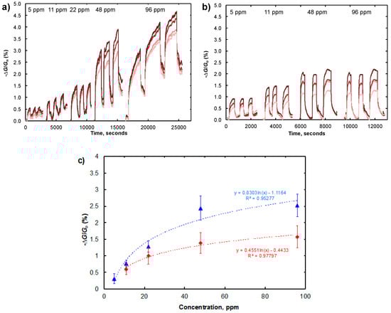 (a) Conductance traces of four P2/SWCNT-based chemiresistors to five concentrations of DMMP in dry N2 at room temperature; (b) Conductance traces of four P2/SWCNT-based chemiresistors to four concentrations of DMMP in air (24% RH) at room temperature; (c) Saturated chemiresistive responses averaged across quadruplicate trials for P2/SWCNT devices for varying amounts of DMMP in dry N2 (blue triangles) and air (24% RH) (red diamonds) at room temperature.