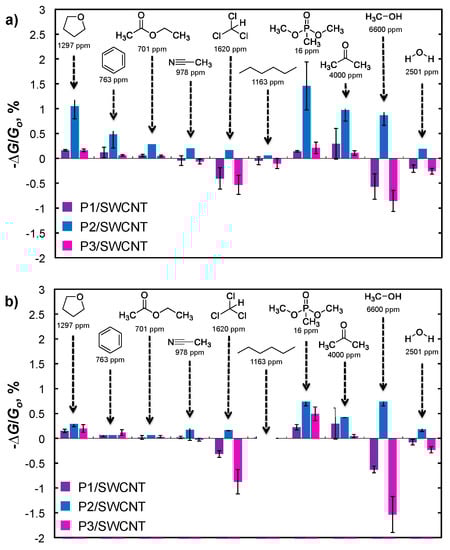 (a) Chemiresistive response ratio (−∆G/G0 (%)/ppm) for P2/SWCNT to VOCs in N2; (b) Chemiresistive response ratio for P2/SWCNT to VOCs in air (24% RH).