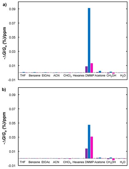 It is clear that the P2/SWCNT is selective as designed in N2 and air. To put this selectivity for DMMP in perspective, we have provided a response ratio by dividing the negative change in conductance by the concentration in ppm [(−∆G/G0)/ppm] at the given flow rate (200 mL/min). Figure 7b shows that the P2/SWCNT response ratio for DMMP in N2 is an order of magnitude larger than that for the P1/SWCNT and P3/SWCNT composites. A similar, though smaller response ratio is shown for P2/SWCNT in air. The P2/SWCNT composite garners a nearly a two orders of magnitude larger response ratio to DMMP over the other VOCs. An interesting result in Figure 6a,b show an increase in conductance for the P1/SWCNT and P3/SWCNT composites upon exposure to acetonitrile, chloroform, hexanes, methanol and water. This may be explained by a secondary doping effect [55]. Considering that the SWCNTs are naturally p-doped by molecular oxygen [56] and that the polymers are strong electron donors, the carrier levels in the SWCNTs will be reduced by strong charge transfer interactions or electron donation from the polymers to nanotubes. Some of the solvents may reduce these interactions and thereby affect an increase in carrier density. If the organic vapor molecules do not have strong interactions with the SWCNTs that pin or scatter the carriers, increased carrier levels will give rise to an increased conduction as we observe.