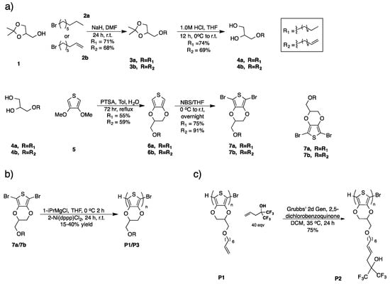 (a) Synthesis of derivatized EDOT monomers for (b) Kumada catalyst transfer polycondensation (c) Post-polymerization modification via alkene cross-metathesis of P1 and allyl-HFIP to form P2.