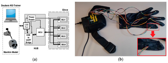 Hardware of IGlove system: (a) Block diagram of main parts of Hub and Glove and their interconnection. Microcontroller and sensors communicate in a single-master, multiple-slave configuration using SPI on a multidrop bus. IMU sensors were configured to sample internal signals from accelerometers and gyroscopes at 8 KHz, and the user-programmable digital low-pass filters were setting up to a cut-off frequency of 125 Hz, using the preconfigured low-pass filters of the sensor. Measurement data is sent via a high-speed USB link to the Daubara NS Trainer; sensors are sampled 100 times per second; (b) Picture of the system showing the connection between Glove and Hub. In this case, sensors were worn on thumb, index, middle, ring fingers, and in the back of the hand. A communication system that transfers data and power between Hub and each sensor has been implemented using a set of thin and flexible cables. A zoom of the thumb is presented in the lower right corner; it can be observed how power and data cables enter to one sensor compartment.