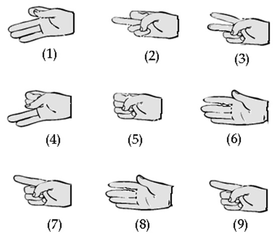 Hand gestures (1 to 9) used in exercises one and two. Those gestures were designed to test the capability of IGlove system for recognizing finger movements, using sensors on the thumb, index, and middle fingers.