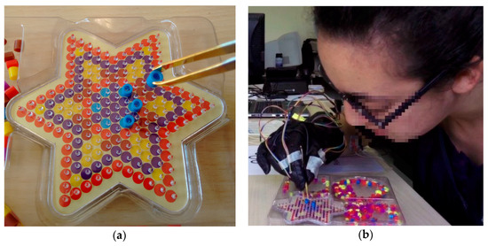 The third exercise of IGlove test: (a) Shows the PegBoard, tweezers holding a plastic bushing (PB) and a portion of PBs deposits on the far right of the image. The PegBoard features many pegs, but subjects only need to put six blue PBs on blue pins and one red PB on each peak of the star; (b) A picture of one of the volunteers while running the third exercise (she is just placing a blue PB on a blue peg).