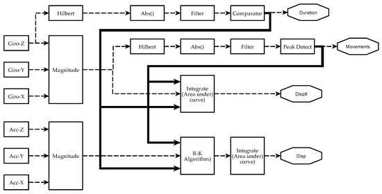 Scheme of signal processing and information analysis to obtain manual dexterity metrics on each sensor. Currently, four metrics have been achieved from IGlove’s raw signals: Duration of exercises (Duration), the number of movements during each exercise (Movements), spatial displacement (Disp), and angular displacement (). The absolute value of the Hilbert transform of a gyroscope signal is filtered to obtain a smoothened signal that is higher than 0 when the hand moves. A comparator decides when the level and duration of a perturbation in the signal were enough to mark it as an exercise. The metric Duration of an exercise is the difference between the end and the beginning of a significant perturbation. Variable Movements is calculated from the magnitude of angular speed (computed from all gyroscopes using Equation (1)). It was observed that peaks on indicate when a movement was performed. To estimate the number of moves, is smoothened, but this time, a peak detector identifies the spikes in the signal that were large enough and have been caused by a valid hand movement. The area under was calculated using numerical integration to estimate . Spatial kinematic parameters were estimated from accelerometers signal (calculated using Equation (3)), Runge–Kutta method was used to obtain an approximate time series for the magnitude of velocity . Finally, spatial displacement is calculated as the area under the curve of . When performing numerical integration, Duration and Movements parameters were used to establish integration limits and estimate initial conditions.