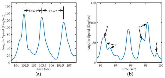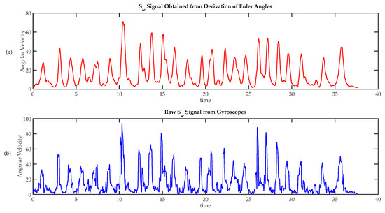 Comparison of techniques to calculate angular speed. (a) Angular velocity calculated from absolute orientation angles , and , obtained using a sensor fusion algorithm; (b) Angular speed calculated from raw gyroscope data.