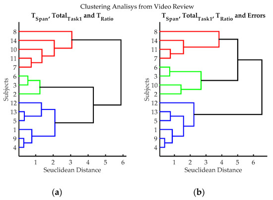 Clustering results according to the variables evaluated from video records of volunteers while executing exercise 3. (a) Clustering classification using variables: TSpan, TotalTask1, and TRatio. Errors were not utilized in this classification process, to evaluate if it introduces subjective bias (Estimating the number of errors is dependent on the judgment of the evaluator); (b) Hierarchical classification using variables: variables TSpan, TotalTask1, TRatio, and Errors. Three groups can be clearly differentiated, blue (volunteers 1, 4, 5, 9, 12 and 13), red (volunteers 7, 8, 11 and 14) and green (volunteers 2, 3, 6 and 10); volunteer 10 can be considered either green or red.