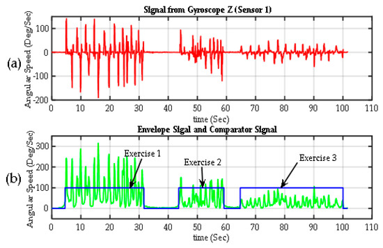 Segmentation of exercises. (a) Raw signal from one Z-axis gyroscope from Sensor 1 on the back of the hand (); (b) the envelope of the previous signal calculated using the transform Gilbert (green). The exercise detection signal (in blue), which is basically the output of a comparator, with values of 100% when > threshold (exercise is detected) and 0% when < threshold (rest periods).