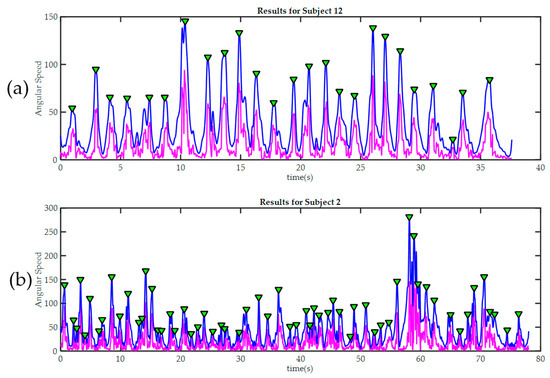 Peak detection results in two trainees during the third exercise. In both cases, the raw signal of magnitude of angular velocity is painted in magenta. The signal after being “smoothed” is painted blue. Detected peaks are marked with green triangles. (a) Subject 12, required only 25 movements to finish the third exercise. It can be seen how the good level of manual dexterity is also reflected in the in the smoothness of the signal acquired by the sensors in the glove; By contrast, subject 2 (b) made many more moves during the exercise; this was because he made several mistakes and then had to correct them. The significant differences in movement amplitude may indicate poor motor control.