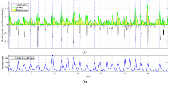 Graph of kinematic spatial parameters for volunteer 12 while playing exercise 3. (a) Black signal is the magnitude of the acceleration, the absolute value of velocity is drawn in green, and the area under the curve (in clear yellow) is ; (b) corresponds to the peak detection of , each pair of peaks were used to set the appropriate time interval for numerical calculations.