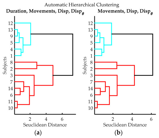 Dendrograms from cluster analysis of volunteers according to variables from data processing of IGlove data. (a) Clustering using Time of Exercise, Peaks quantity, spatial displacement and angular displacement; (b) Clustering using Peaks quantity, spatial displacement, and angular displacement.