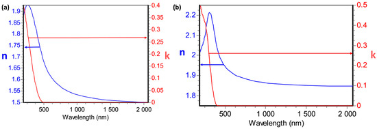The first parameter that was studied was the RI of indium oxide. RI is a complex number consisting of a real part (n) and an imaginary part (k) or extinction coefficient. Both components of the RI can be determined by ellipsometry measurements, which have been done using Uvisel-2 ellipsometer from Horiba (Kyoto, Japan). In Figure 1, n and k are plotted, as a function of the wavelength, for high and low vacuum conditions.
