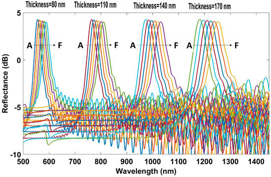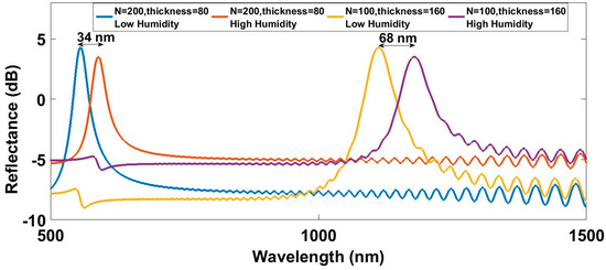 The tuning of the reflection wavelength, given a specific material, is achieved changing the thickness of each layer. In order to study the influence of the thicknesses of the lower and higher refractive index layers on the humidity sensitivity, the following parameters were used: the number of periods was set to 50 and the thickness of odd and even layers was swept from 80 to 170 nm in 30 nm intervals. The simulated results are shown in Figure 4.