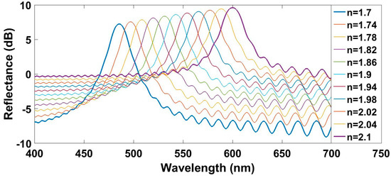 The last factor analyzed is the RI of the layers composing the grating. In order to obtain a fair comparison, the ratio between the RIs of the even layers and the odd layers was always kept constant and equal to the ratio used in previous simulations, and the sensitivity obtained is analyzed as a function of the reflection wavelength. RI of LRIL was swept from 1.7 to 2.3, while RI of HRIL was always maintained 4% greater. In Figure 5, the obtained spectra for different refractive indices and a fixed thickness for each layer of 70 nm are plotted. The legend of Figure 5 refers to the RI of the LRIL. It can be seen that an increasing difference between the RI of the optical fiber and the material lead to lower contrast. Reflected spectra with a worse-defined peak might difficult the performance of the processing algorithm.