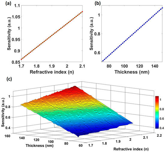 Figure 6 shows the linear dependence of the sensitivity with respect to (a) the RI and (b) the thickness. In Figure 6c a 3D graph representing the sensitivity as a function of the RI and the thickness is plotted. The sensitivity increases with the RI of the material, but its dependence is weaker than the one obtained for the thickness, due to its lower influence on the optical path. That means that it is easier to place the reflection peak at greater wavelengths and, consequently, obtaining greater sensitivities by increasing the thickness than by increasing the RI.