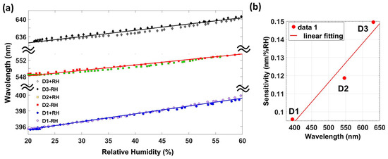 Here the performance of devices D1 to D3 is discussed. Device D1 consists of 60 periods of 115 nm each, which leads to obtaining a reflected peak at 390 nm. Device D2 consists of 50 periods of 162 nm, which has its reflected peak located at 550 nm, and the last device analyzed (D3) consists of 24 periods, has its reflected peak located at 635 nm, and has an overall thickness of 4.4 µm. This device has the smaller overall thickness, but the optical path of each period results in the reflected peak being located at greater wavelengths. In Figure 7a, a comparison of the wavelength shift of the three devices developed on the 20–60%RH is shown. The hysteresis for this RH range is 1.3%RH. Finally, the sensitivity of these devices is plotted as a function of the reflection wavelength in Figure 7b.