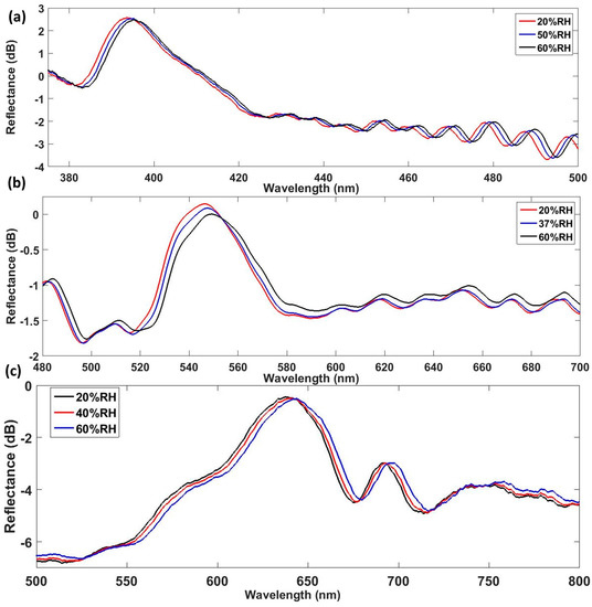 Measured reflected spectra for different RH values obtained with (a) device D1, (b) device D2, and (c) device D3.