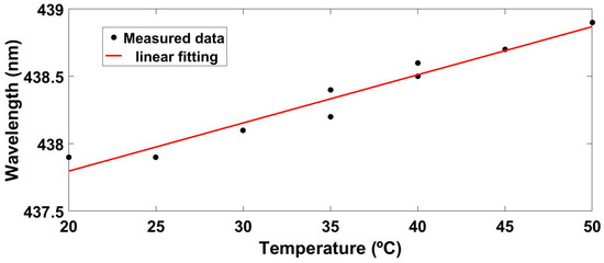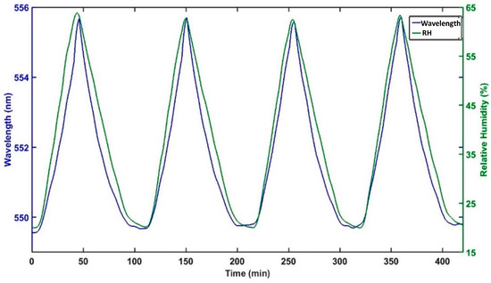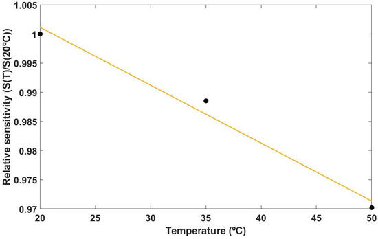 The sensitivity of the device to temperature has also been studied and for this purpose the same experimental setup of Figure 2 was used. The temperature was changed from 20 to 50 °C in 5 °C steps, while RH was kept constant at 20%RH and the measured results are shown in Figure 11. As it can be seen, the Bragg wavelength shifts 1 nm to greater wavelengths as the temperature increases from 20 to 50 °C. This response is linear as it can be observed in Figure 11. This optical structure has a sensitivity of 0.036 nm/°C, which leads to a cross thermal sensitivity of 0.36%RH/°C and to a linear coefficient of thermal expansion of 7.6 × 10−5 (°C)−1.