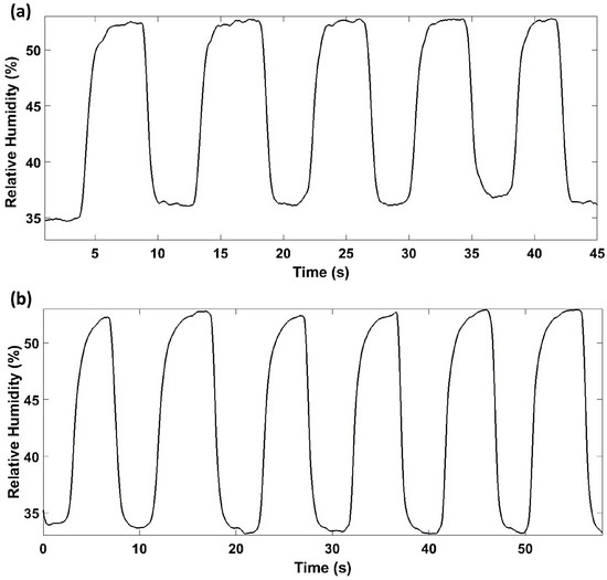 Finally, the response time of the device has been studied. Two different devices, devices 4 and 5, were analyzed to compare the effect of the number of periods. It was necessary to change the setup in order to measure the response time due to the relatively slow slope of the climatic chamber. Therefore, changes on the relative humidity were produced by using different salt solutions, such as magnesium chloride, which provides a constant RH environment of 33%RH, and magnesium nitrate, which provides a controlled environment at 53%RH. The two different optical fiber humidity sensors were alternatively immersed in these environments. Figure 12 shows the dynamic response of both devices. The rise time is 1.9 s, whereas the fall time is 1.4 s. There is no noticeable differences between both devices. The fact that the value of the rise time is greater is attributed to the method of the measurement, since desorption time is usually greater.