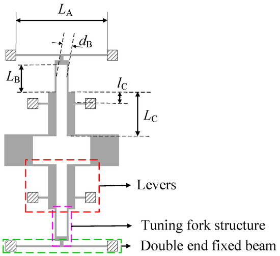 Generally, in order to improve the consistency of processing, the same width is applied to all slender beams. In this design, the width of the slender beam is 10 m. This paper mainly introduces the effects of dimensions , , , and on the in-phase and the anti-phase coupling stiffness. presents the length of the double-ended beam; presents the length of the tuning fork beam; presents the gap between the two tuning fork beams; presents the length of the lever; presents the length of the lever’s resisting arm. The initial values of , , , and are shown in Table 2.