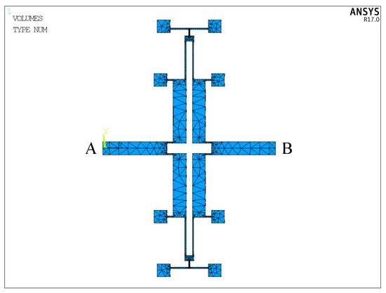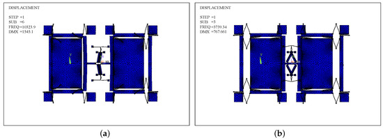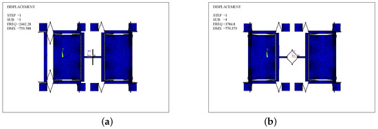 The mode analyses of Type-A in the in- and anti-phase modes in the driving direction are carried out and shown in Figure 12a,b, and the mesh element is SOLID 95. The in- and anti-phase frequencies (,) are 2442.28 Hz and 3784.8 Hz, respectively. Similarly, the mode analysis of Type-B is made.