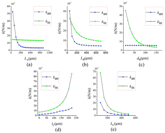 The stiffness can be calculated by formula . Figure 7 shows the finite element model of the lever coupling mechanism. The thickness of the structure is 60 m, and the mesh element is SOLID95. The element, which can tolerate irregular shapes without as much loss of accuracy, is defined by 20 nodes having three degrees of freedom per node: translations in the nodal x, y and z directions. The element may have any spatial orientation. SOLID95 has plasticity, creep, stress stiffening, large deflection and large strain capabilities. Various printout options are also available [30]. The silicon material properties are listed in Table 3 [31,32]. By applying a constant force on Surface-A and -B along the driving direction as shown in Figure 6, the displacement can be obtained by ANSYS static analysis. Then, the in-phase and anti-phase coupling stiffness are obtained. Figure 8 illustrates the relationship between the in-phase coupling stiffness, as well as the anti-phase coupling stiffness and , , , and , respectively.