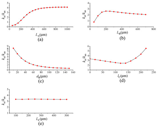 The ratio of in-phase coupling stiffness to the anti-phase coupling stiffness is shown in Figure 9. Figure 8a indicates that chiefly influences the anti-phase coupling stiffness, while principally decides the in-phase coupling stiffness, as described in Figure 8c. It can be seen from Figure 9b,d that the ratio shows a rapid increase at first and then decreases gradually as increases, yet it presents an increasing tendency after decreasing at the beginning as increases. Therefore, the maximum ratio can be obtained by optimizing and . Figure 9e reveals that has an equivalent effect on both in-phase and anti-phase coupling stiffness. Therefore, the appropriate level of the in-phase and the anti-phase coupling stiffness can be gained by optimizing .