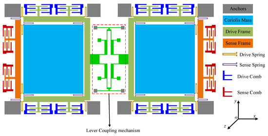 According to the above analysis, it is necessary to design a coupling mechanism, for which the in-phase stiffness is greater than the anti-phase stiffness. Then, the in-phase mode frequency of the gyroscope would be higher than the anti-phase mode frequency, which could reduce the shock response without loss of mechanical sensitivity. A lever coupling mechanism is proposed based on the improved coupling method, as is shown in Figure 5. The architecture is completely symmetrical. The coupling structure is formed with three parts: