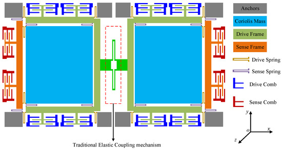 Much research on the development and analysis of the silicon micro-gyroscope structure has been done in our previous work [24,25,26,27,28,29]. Therefore, this section mainly introduces the design and analysis of the coupling mechanism.