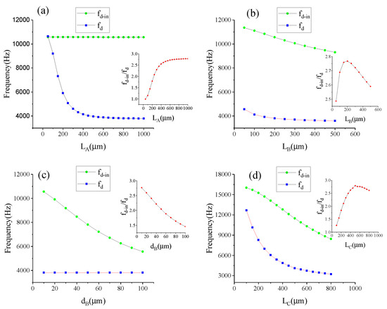 According to the analysis in Section 4.2, the value is zero to get a higher ratio, as well as to get a smaller anti-phase mode stiffness. Figure 13 shows the relationships between , and of Type-B and , , , . It can be see that chiefly influences the value of , while principally decides the value of . and can influence both the and values. As depicted in the inset figures, the maximum ratio can be obtained by optimizing and . According to the expressions and , Figure 13 can confirm the trend in Figure 8 and Figure 9.