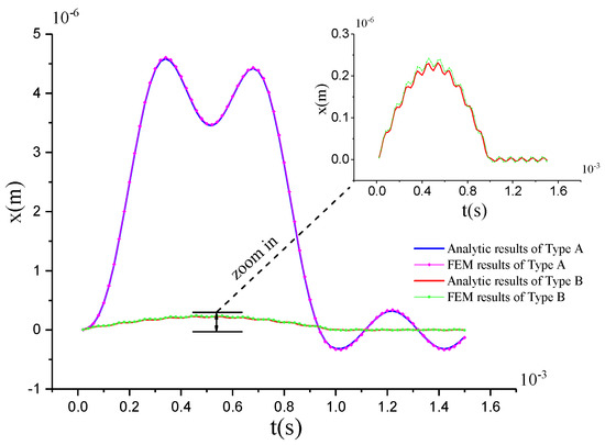 In the simulation, shock load with peak acceleration g and duration time s is applied to both samples in the drive direction. Both the analytic results and the FEM results of two types are shown in Figure 16. Comparison of the peak of the shock response is provided in Table 7.