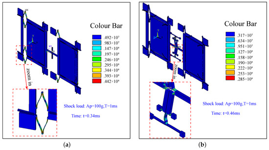 Figure 17 shows the stress distributions of Type-A (a) and Type-B (b) at the maximum impact displacement, respectively. It is obvious that the stress in Type-B is far lower than that in Type-A, which shows that the lever coupling mechanism is notably effective at reducing the stress caused by shock loads. Therefore, the Type-B structure with the designed coupling mechanism can truly reduce the impact response displacement and impact load stress.