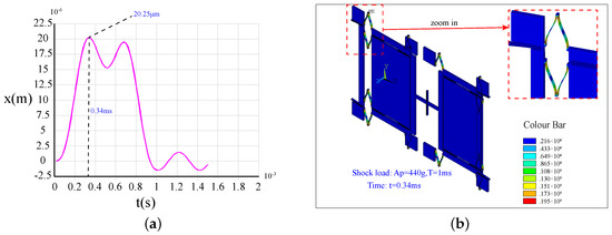 The shock response (a) and the stress distributions (b) at the maximum impact displacement of Type-A under a 440 g shock load.