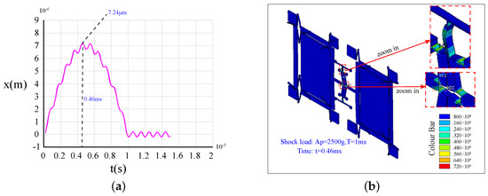 The shock response (a) and the stress distributions (b) at the maximum impact displacement of Type-B under a 2500 g shock load.