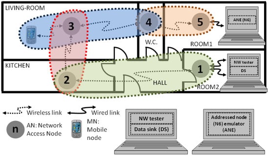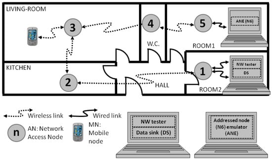 The network includes some wireless access nodes (ANi) and mobile nodes (MNij), as shown in Figure 1. The MNij, as the ANi, would include some sensors and actuators depending on the application of the network. The ANi in Figure 1 are deployed all through the home to provide wireless network connectivity to the MNij. Many types of sensor are included in home automation solutions (security system or alarm, smoke detector, CO2 level detector, glass break sensor, window open sensor, motion or presence detector, door open sensor, smart door lock, air conditioner, humidity sensor, temperature sensor, luminance sensor, occupancy sensor, light controller, etc.). They can be attached to both access and mobile nodes with wireless connectivity.
