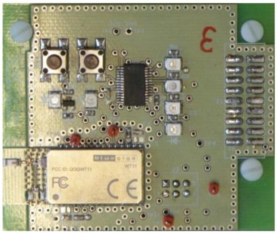 One of the implemented proprietary nodes can be seen in Figure 2. The nodes included the WT-11 chipset of Bluegiga [36], general-purpose input and output components, and some test pins. The chipset included a firmware developed by Cambridge Silicon Radio [37], named BlueCore4 [38], that eases the low power modes defined in the Bluetooth specifications and analyzed in this manuscript, i.e., park and sniff. In addition to the firmware, a proprietary middleware was designed using BlueLab [39], the software tool to develop embedded software given by the manufacturer of the chipset [37]. BlueLab eases the programming of the nodes at the HCI level, the lowest level that any proprietary middleware can access within the Bluetooth protocol stack. The middleware included the processing tasks, which were limited to the most basic operations to restrict their influence in the latency. Moreover, the middleware integrated processes to initialize the communications, present the operation status and route data to other nodes.
