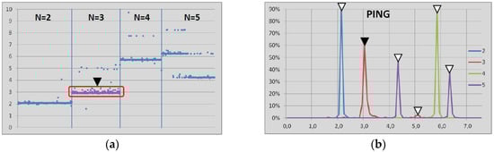 Example of the analysis of the set of latency samples measured in the tests. (a) Set of samples for the case of sending ping data-packets through from 2 to 5 hops (N) while operating in the sniff mode with 2 s of inactivity interval. The red square gathers the samples inside a subseries identified as the latency when the ping data-packet takes three hops. (b) Histograms of the samples for different amount of hops for the same cases, where the subseries of samples are identified with the white triangles.