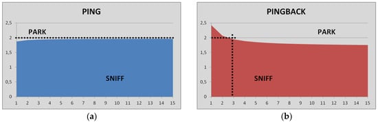 In the range of period of inactivity recommended, i.e., up to 2 s, when the multi-hop communication takes place from master to slave (ping data-packets), the park mode is always the best option for the amounts of hops depicted in Figure 5a, as it provides lower values of latency than the sniff mode. On the contrary, if the multi-hop communication takes place from slave to master (pingback data-packets) and the inactivity interval is 2 s duration, the park mode is the best option in terms of latency, when three or more hops are included in the multi-hop communication. As a summary, for inactivity interval below 1.5 s duration, the sniff low power mode provides the best latency results in Bluetooth multi-hop networking.