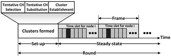 A timeline showing the operations of DCE: to form a cluster, the network goes through three main operations in the set-up stage, i.e., tentative CH selection, tentative CH substitution and cluster establishment; in the steady-state stage where data transmission is performed, the operation is divided into frames and each node transmits its data in assigned time slot.