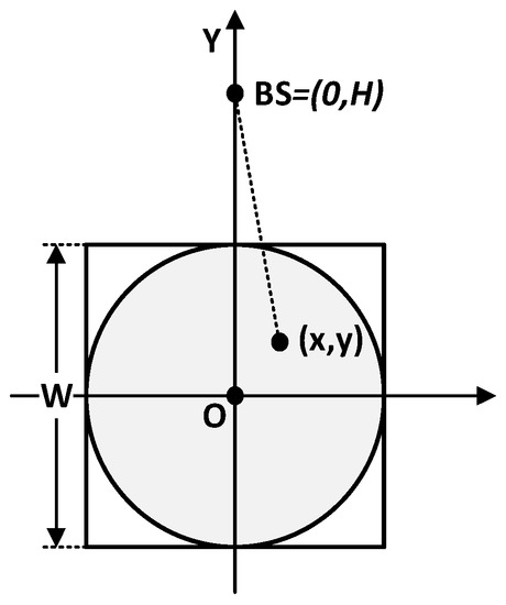 Consequently, we get from Equation (12). Since we have limited the location of the CH to the grey circle instead of the whole square area, some correction factor should be added to . Through simulations, we can deduce that the actual distance is 1.12 times the value of . Thus, we modify the value of to