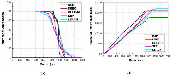 We compare the proposed DCE protocol with LEACH, SEP, DEEC, and DEEC-RE. Note that in our simulation, we follow the modifications to SEP in [18], to make SEP suitable for a multi-level heterogeneous WSN. DEEC-RE is a modified DEEC protocol which keeps the residual energy part in Equation (6), but holds other characteristics of DEEC. Indeed, evaluating the performance of SEP and DEEC-RE contributes to comparing the impacts of initial energy and residual energy.