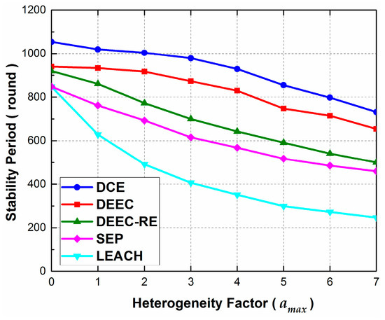 As we can observe from Figure 5, the stability periods of all protocols decrease monotonically with . The reason is that the distributed protocols can’t fully optimize network performance, and severe energy heterogeneity worsens the condition of energy load distribution, which is reflected in stability time. Nonetheless, it should be noted that we are exploring and emphasizing the effect of energy heterogeneity, instead of comparing distributed and centralized designing. Moreover, the proposed protocol performs better than other protocols when changing . When , which means the WSN turns back into a homogeneous one, the performance of DEEC and DEEC-RE are almost the same, and this is also true for LEACH and SEP. The reason lies in the fact that the parts of initial energy level in the election probability function lose their meaning when no energy heterogeneity exists. However, with the increase of , the stability period of LEACH drops much faster than other protocols, and the performance gap between DEEC and DEEC-RE increases as well. Thus, we may infer that, both the initial energy and the residual energy have effects on the stability period, and they should be taken into account when designing the function of election probability.